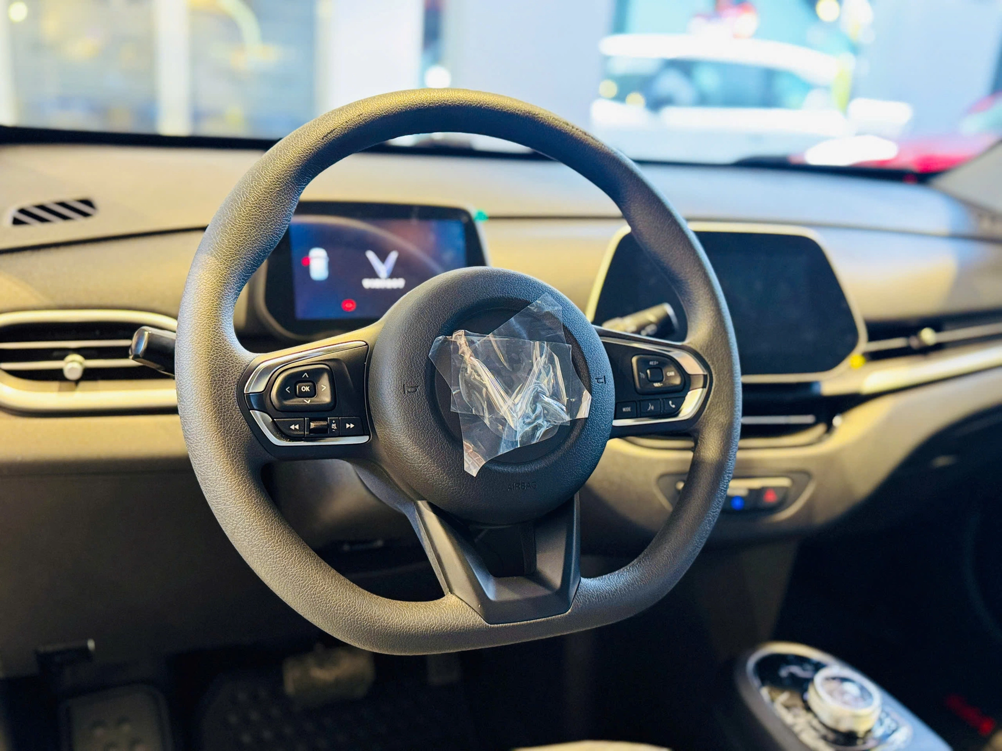 Phía dưới màn hình trung tâm là cần số và phanh tay điện tử được tích hợp dạng lẫy gạt. Các nút chức năng xoay điều khiển hệ thống giải trí, bấm đèn khẩn cấp, hạ kính bố trí ngay cạnh khay đựng cốc giống “đàn anh” VF8 và VF9.