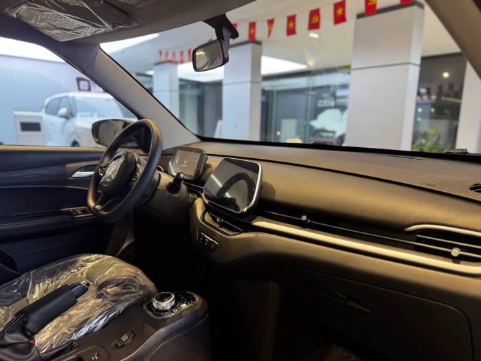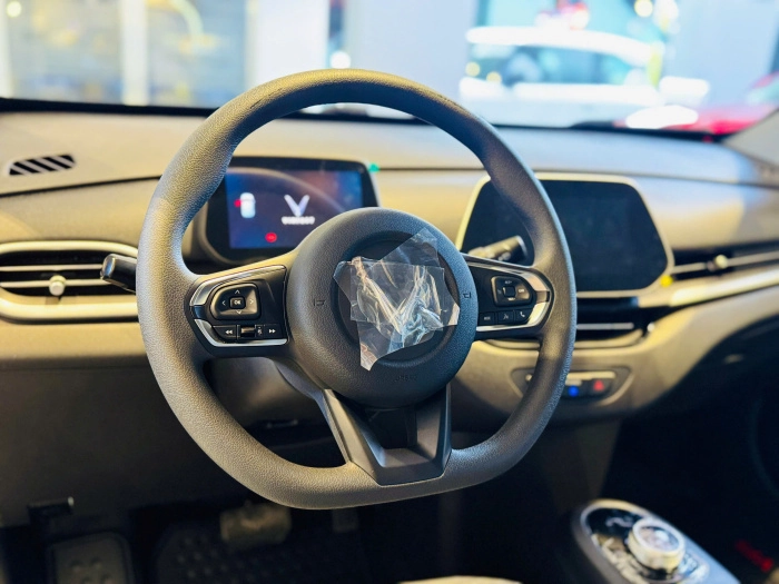 Vô-lăng xe là dạng D-cut thể thao với các điểm nhấn màu bạc, góp phần mang đến vẻ sang trọng cho mẫu SUV điện cỡ nhỏ. Bên trái vô-lăng bố trí các phím bấm media tiện dụng.